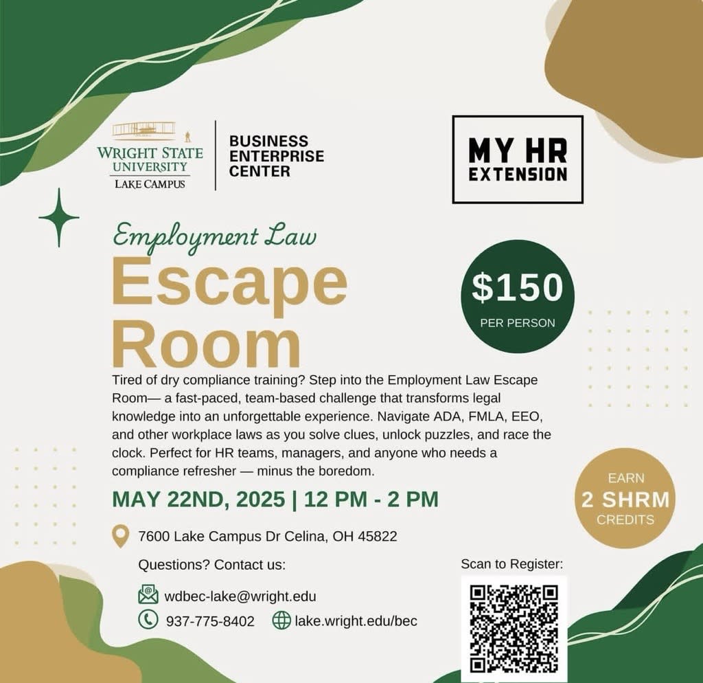 Employment Law Escape Room Tired of dry compliance training? Step into the Employment Law Escape Room - a fast paced, team-based challenge that transforms legal knowledge into an unforgettable experience. Navigate ADA, FMLA, EEO, and other workplace laws as you solve clues unlock puzzles, and race the clock. Perfect for HR teams, managers, and anyone who needs a compliance refresher- minus the boredom. May 22nd, 2025 12PM-2 PM 7600 Lake Campus Dr Celina, OH 45822 Questions? Contact us: wdbec-lake@wright.edu 937-775-8402 lake.wright.edu/bec $150 per person Earn 2 SHRM credits