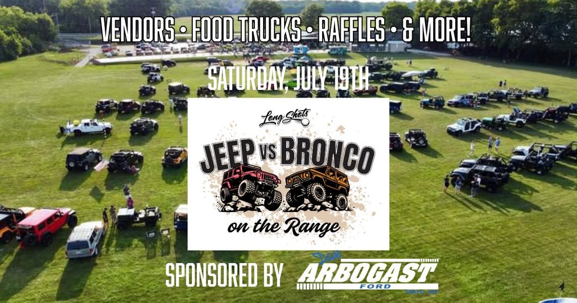 We are thrilled to announce this year's sponsor for the Jeep vs Bronco on the Range 2025 - Dave Arbogast Ford! 🎉 Thanks to their incredible support, this year’s event will be even bigger & better! Check out the details below: Jeep vs Bronco on the Range 2025 SPONSORED BY Dave Arbogast Ford! -$10 entry fee per Jeep or Bronco. Click here to pay your entry fee (or to purchase a t-shirt): https://www.eventbrite.com/e/jeep-vs-bronco-2025-tickets-1303036389919?aff=ebdssbdestsearch 100% of your entry fee will go straight to supporting our wonderful neighbors, the Miami Valley Veterans Museum! Learn more about them here: https://www.miamivalleyveteransmuseum.org/ -You must pay an entry fee online through Eventbrite for your vehicle to enter the Range. No refunds will be available. This event is rain or shine! -PRE ORDER your Jeep vs Bronco on the Range 2025 t-shirt on Eventbrite. $25 per shirt. Choose your size at check out. -Check in will take place on Saturday, July 19th from 4-6pm. -Prizes & Awards- more info to come! 🏆 Don't own a Jeep OR a Bronco? No worries! This event is free to attend. Here's what to expect: •Jeeps & Broncos galore! Take a walk out on the driving range to check out the vehicles! •Vendors, Food Trucks & More. •Our bar/restaurant will be open from 12-10pm for all your food & drink needs! •DJ Donnie from Inferno Productions will be here with the good music from 4-10pm. •RAFFLES! VENDORS: -TD Custom Prints -JG Roofing & Renovations -Valkyrie Ohio Off-road Jeep Club -Badass Bulldog Rescue -Shake It Up Drinks -WE Wrap